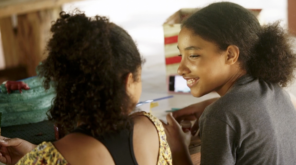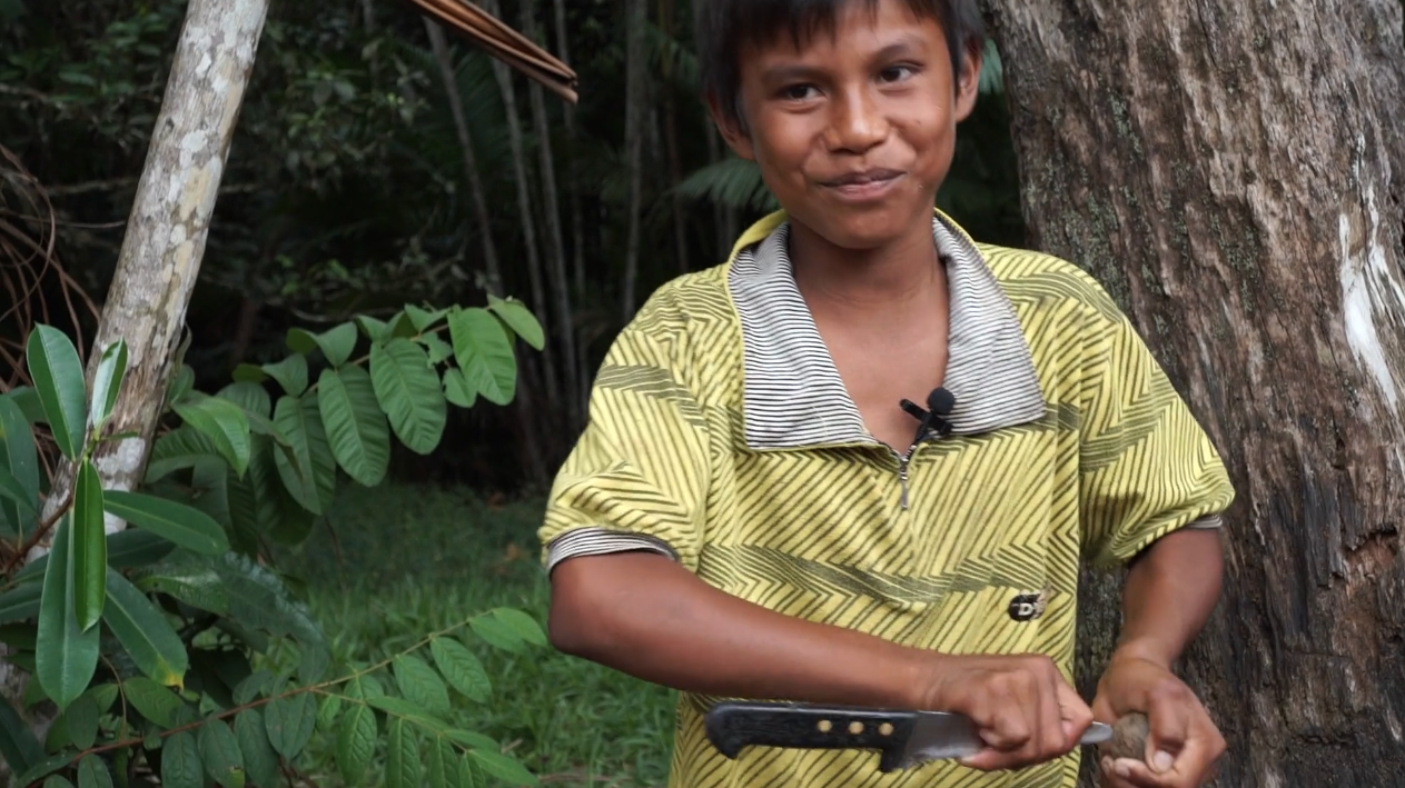As crianças da comunidade indígena de Balaio, Amazonas, ensinam como fazer um pião com sementes e paus que encontram no mato.